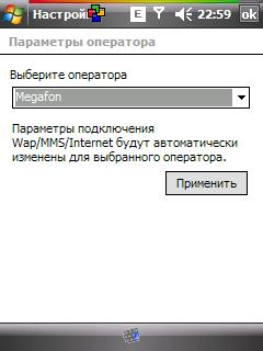 OneOne если я правильно понял настройки своего оператора ты внесла и сохранила... а ты хочешь поставить профиль своего оператора "по умолчанию" при входе в инет если так,тогда... Пуск - Настройки - Подключения там опять же заходишь а меню Подключения ,снизу выбираешь Дополнительно ... там жмешь на кнопочку Выбрать сети и в верхней и гижней строчках выбираеш профиль своего оператора,жмем ок) теперь при входе в интернет автоматически должно подключать через профиль твоего оператора